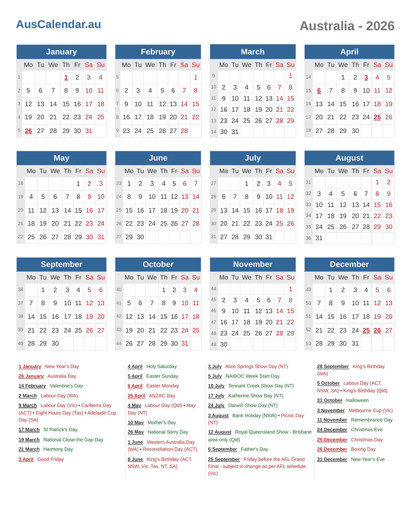AusCalendar is an online calendar for Australia with the information of public holidays, school holidays, and observances.