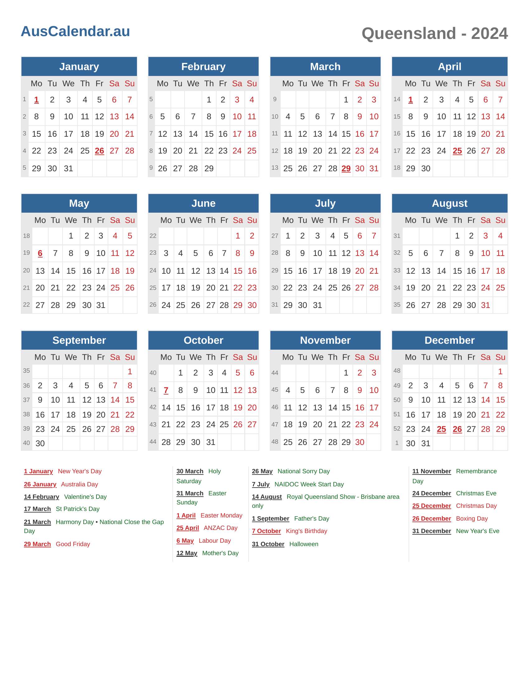 Queensland Calendar 2024