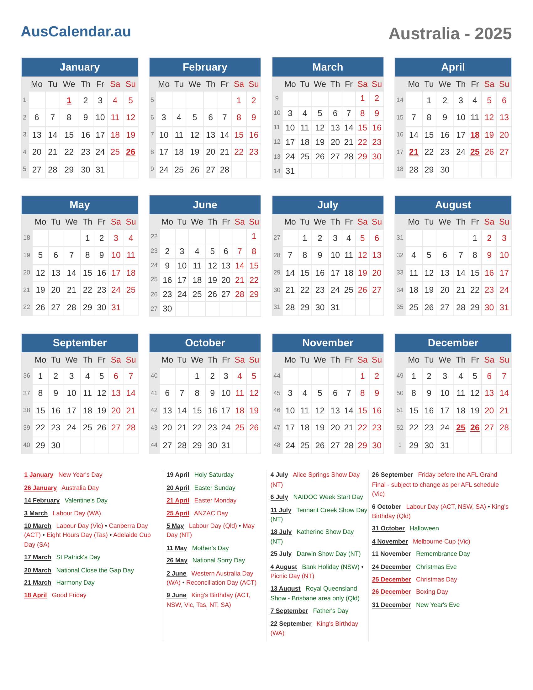 Bank Holiday (NSW) • Picnic Day (NT) |