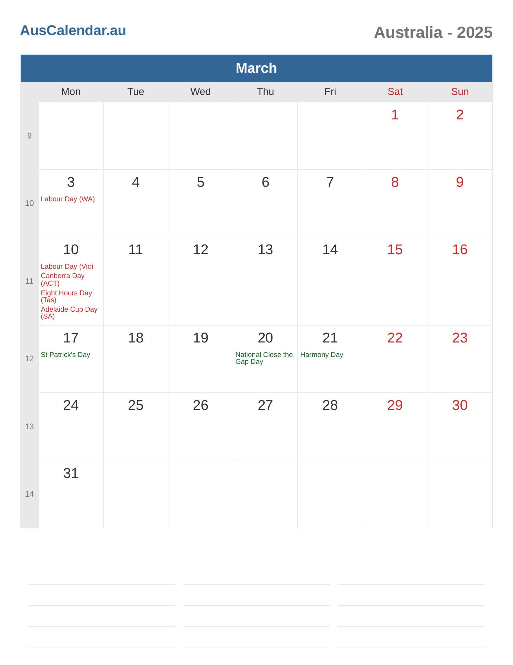Labour Day (Vic) • Canberra Day (ACT) • Eight Hours Day (Tas) • Adelaide Cup Day (SA) |