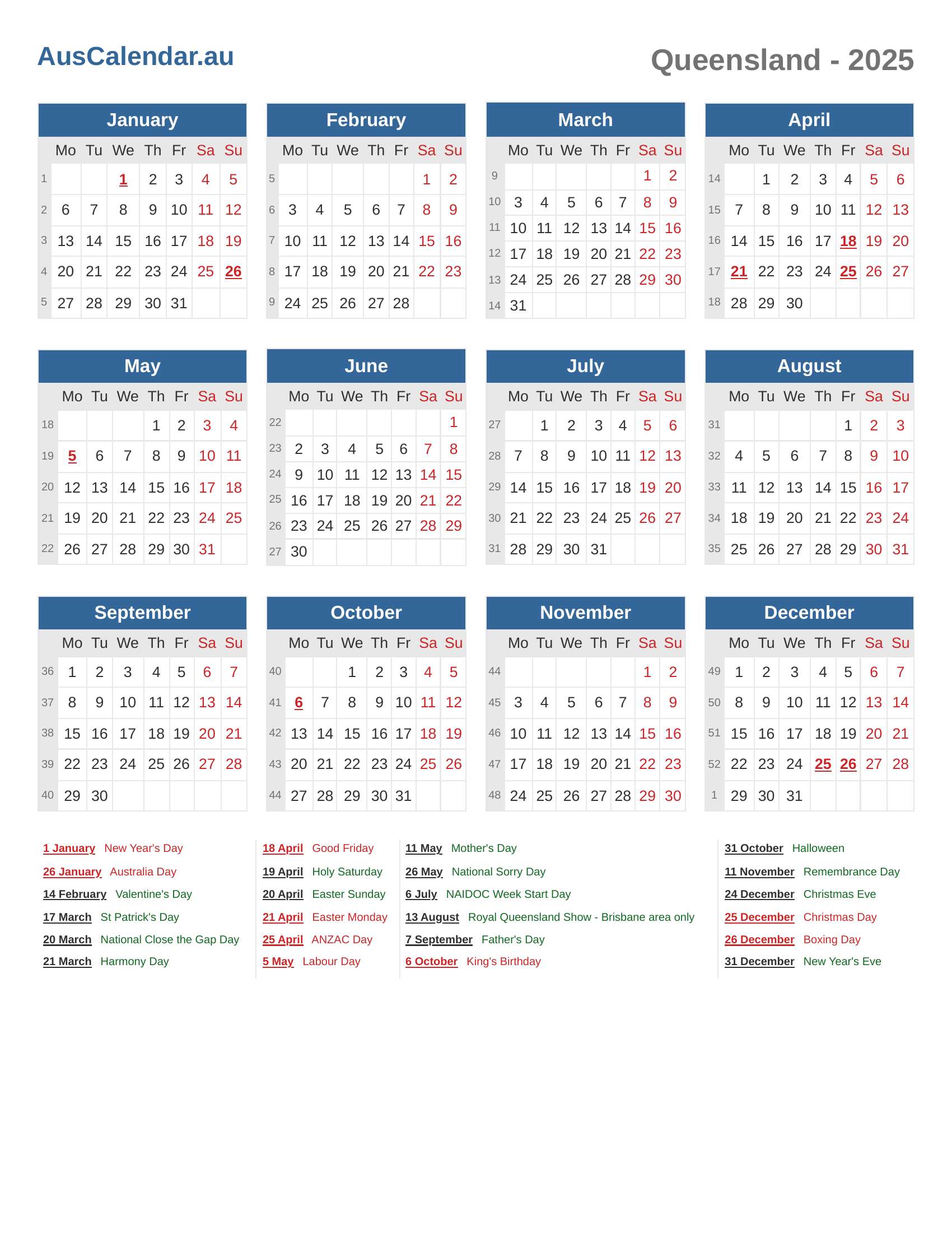 Calendar 2025 - Queensland