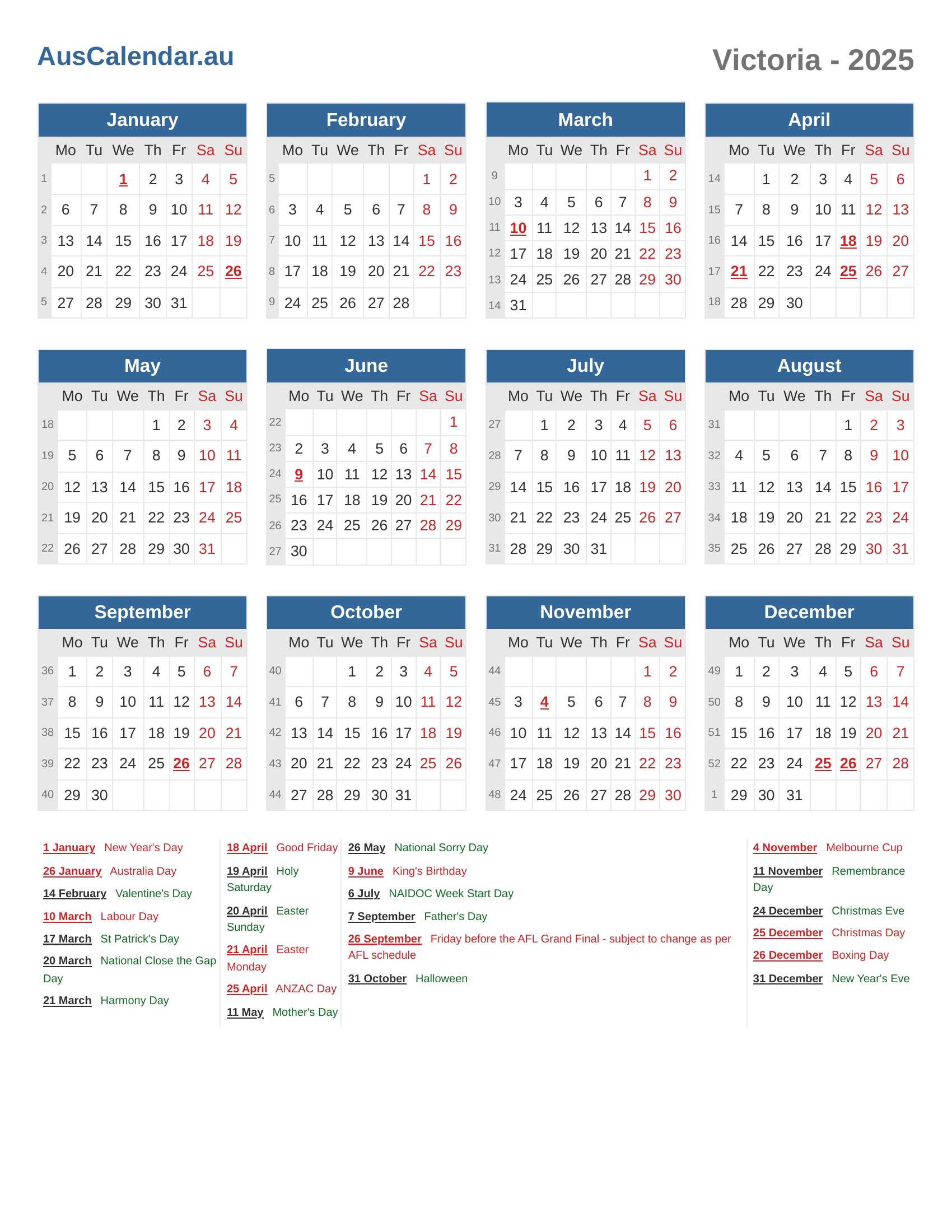 Calendar 2025 - Victoria