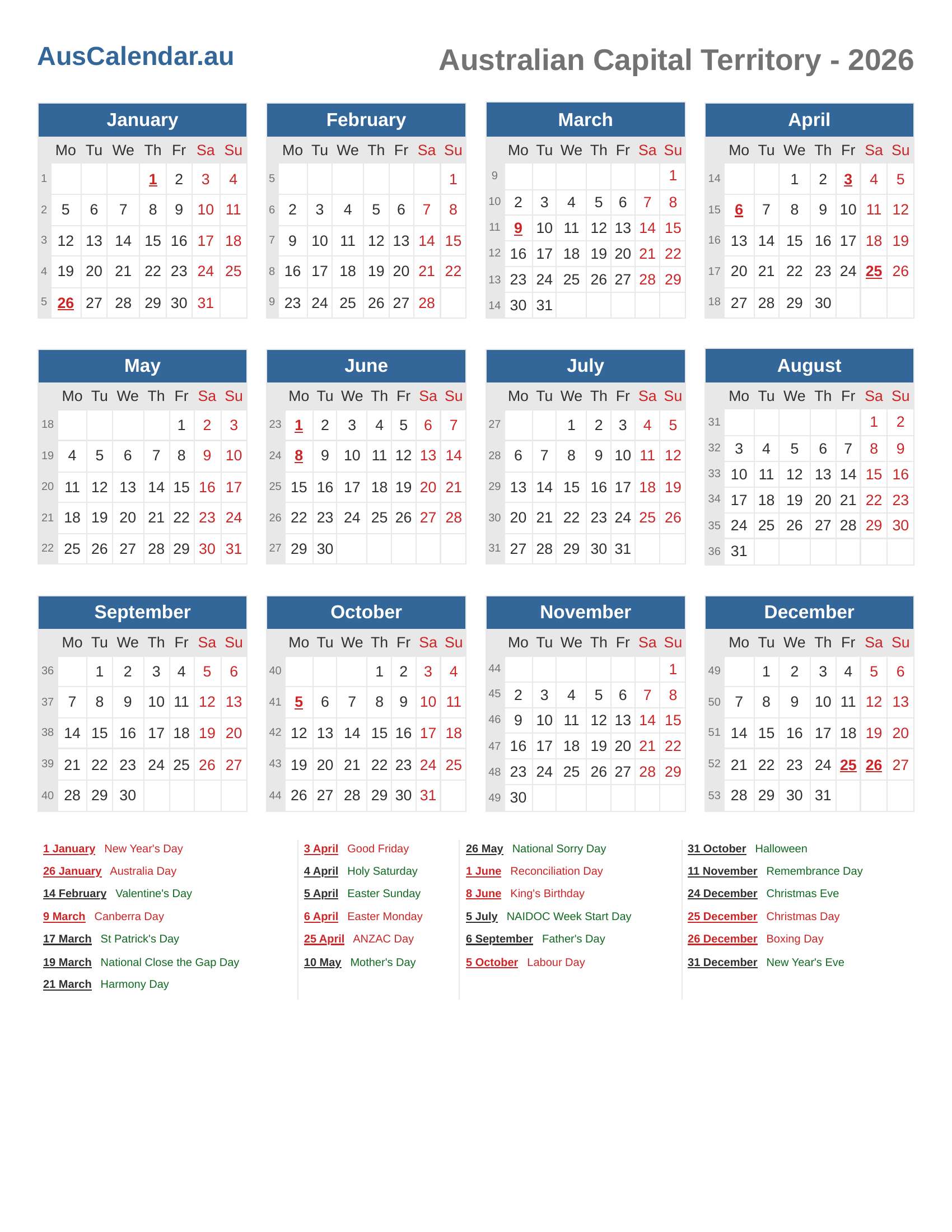 Australian Capital Territory Calendar 2026