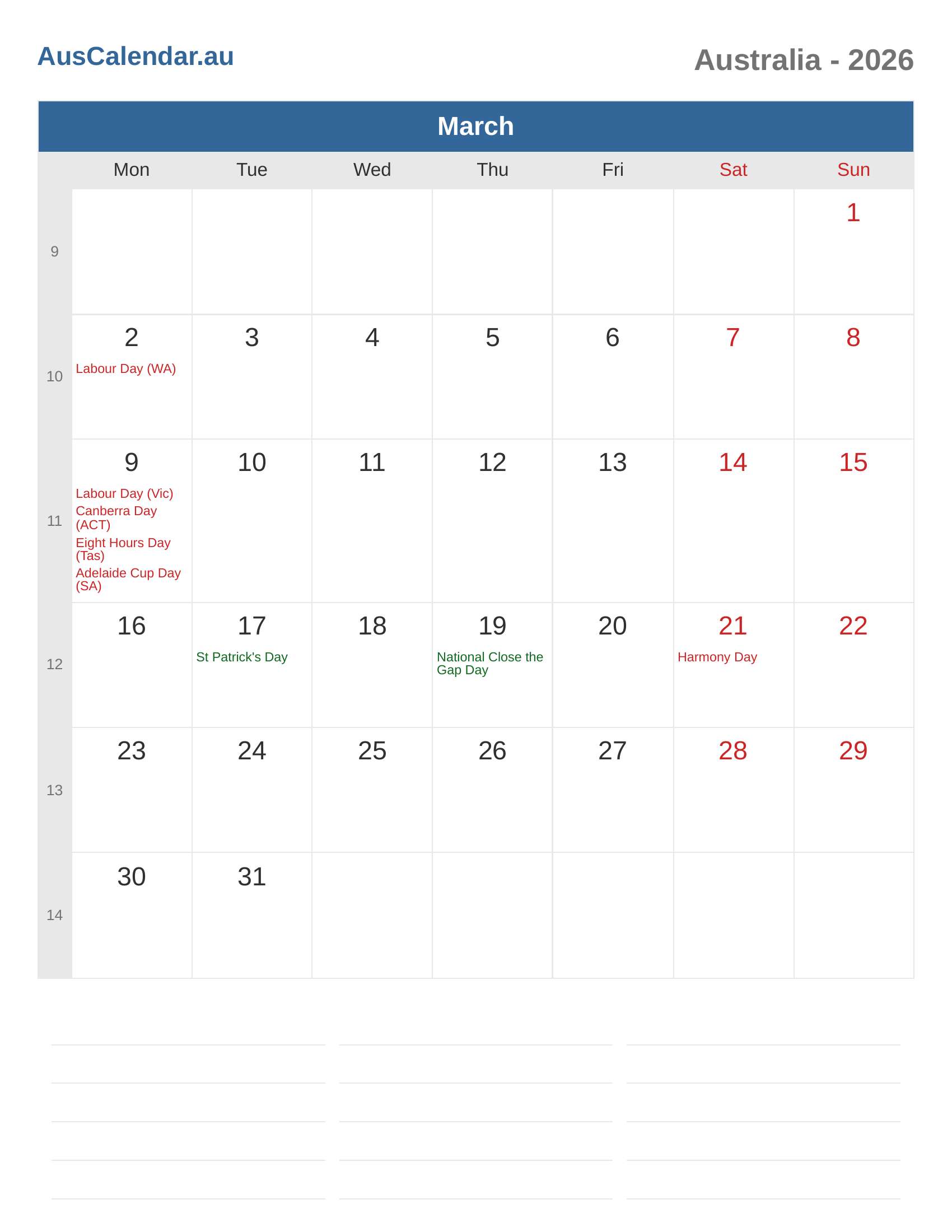 Labour Day (Vic) • Canberra Day (ACT) • Eight Hours Day (Tas) • Adelaide Cup Day (SA) |