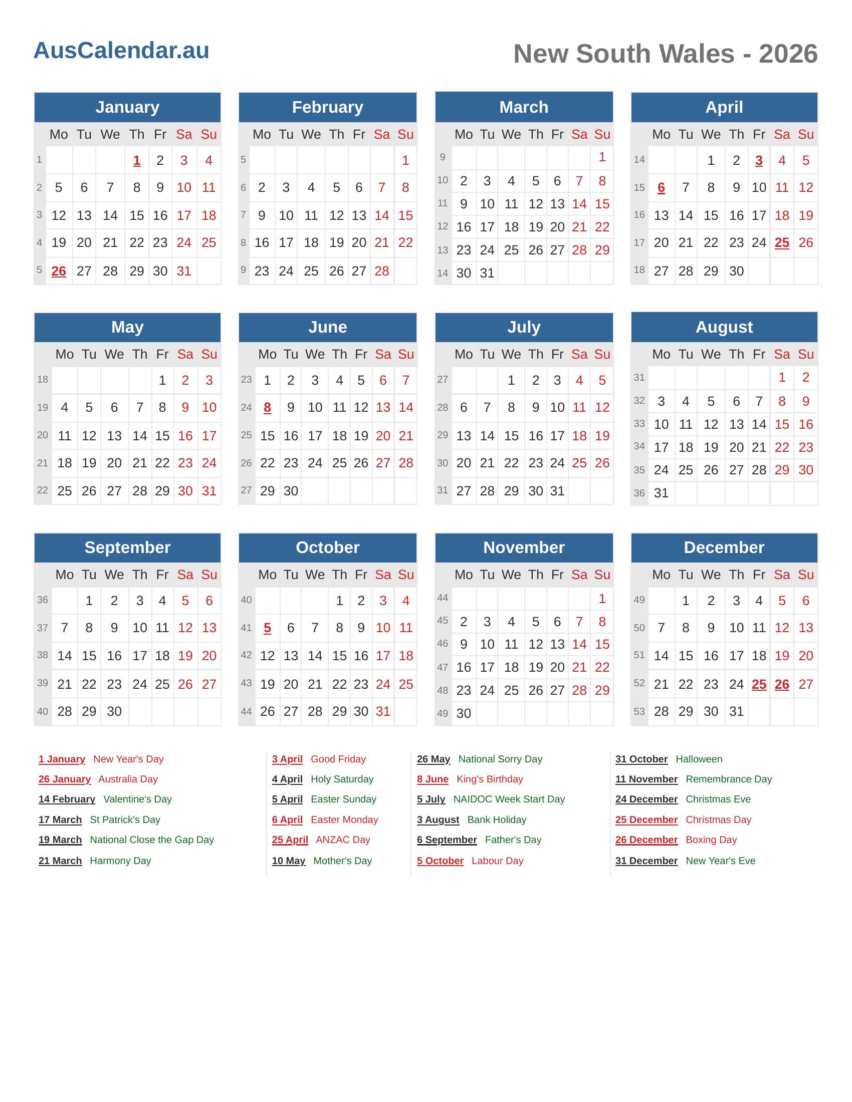 New South Wales Calendar 2026