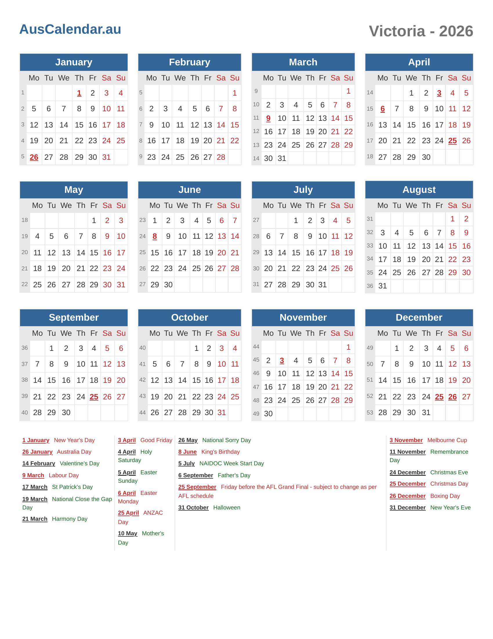 Victoria Calendar 2026