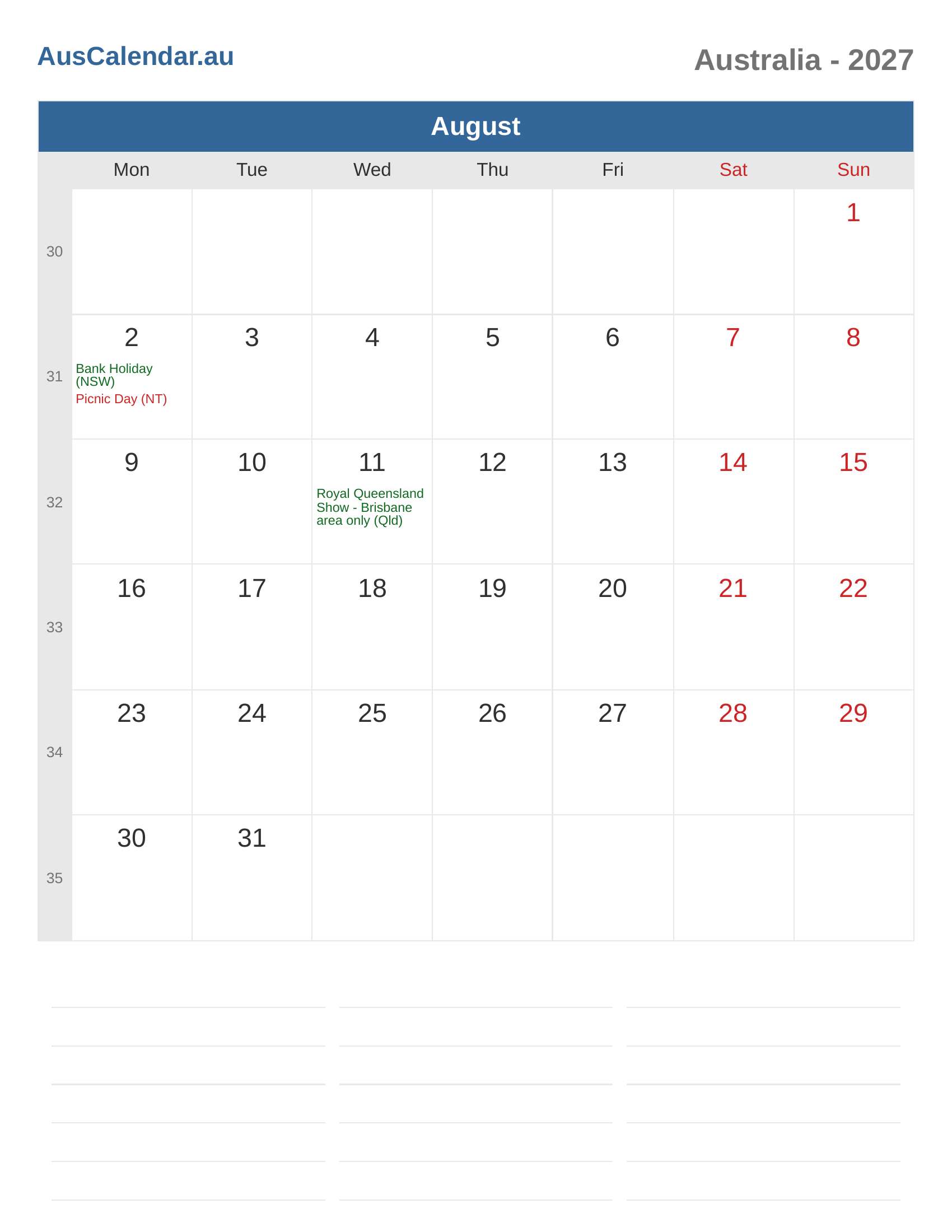 Bank Holiday (NSW) • Picnic Day (NT) |