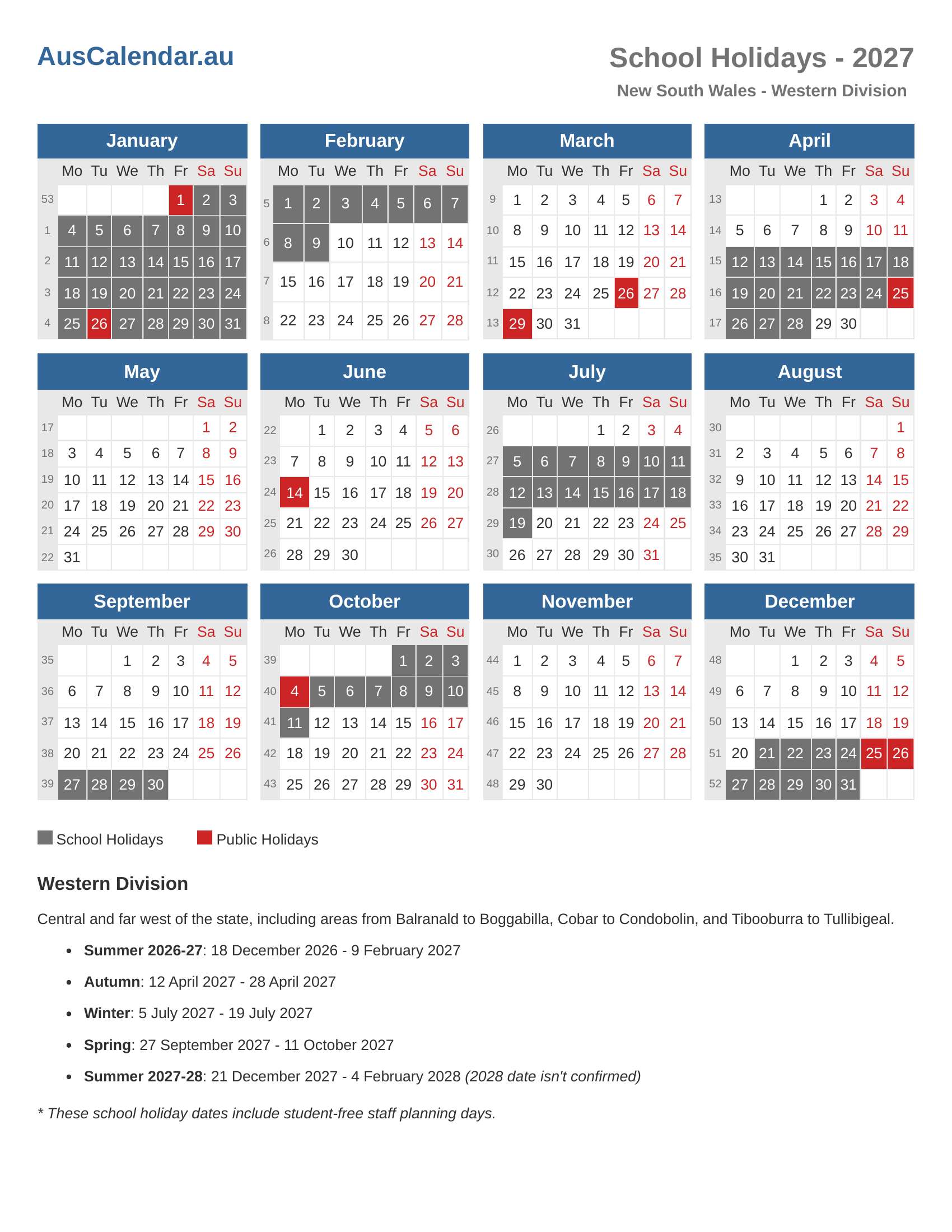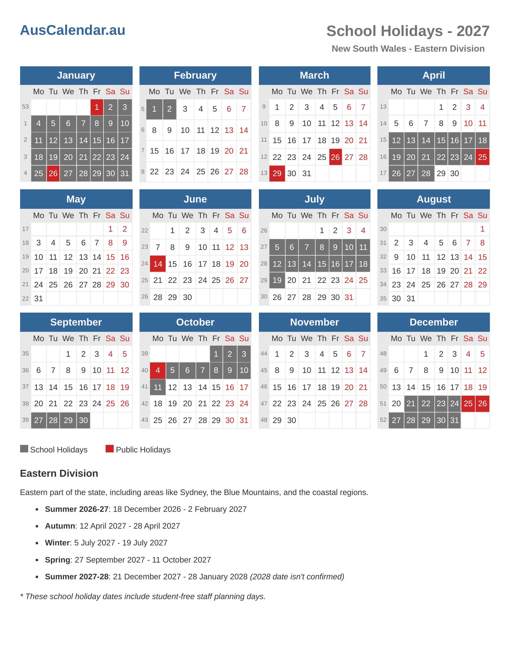 Summer 2026-27: 18 December 2026 - 2 February 2027