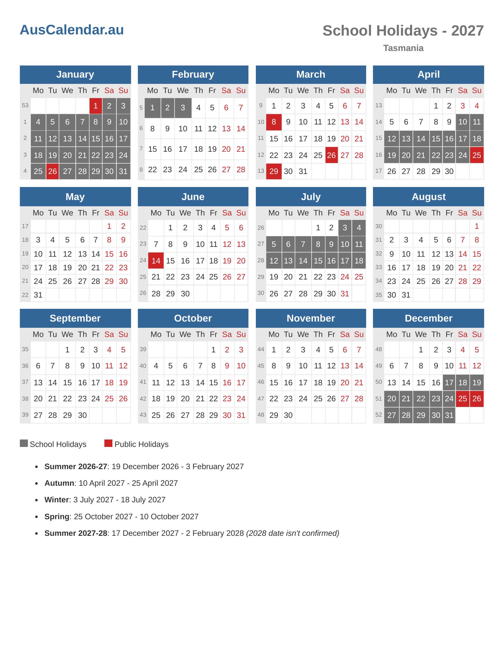 Download School Holidays 2027 Calendar (Tas)