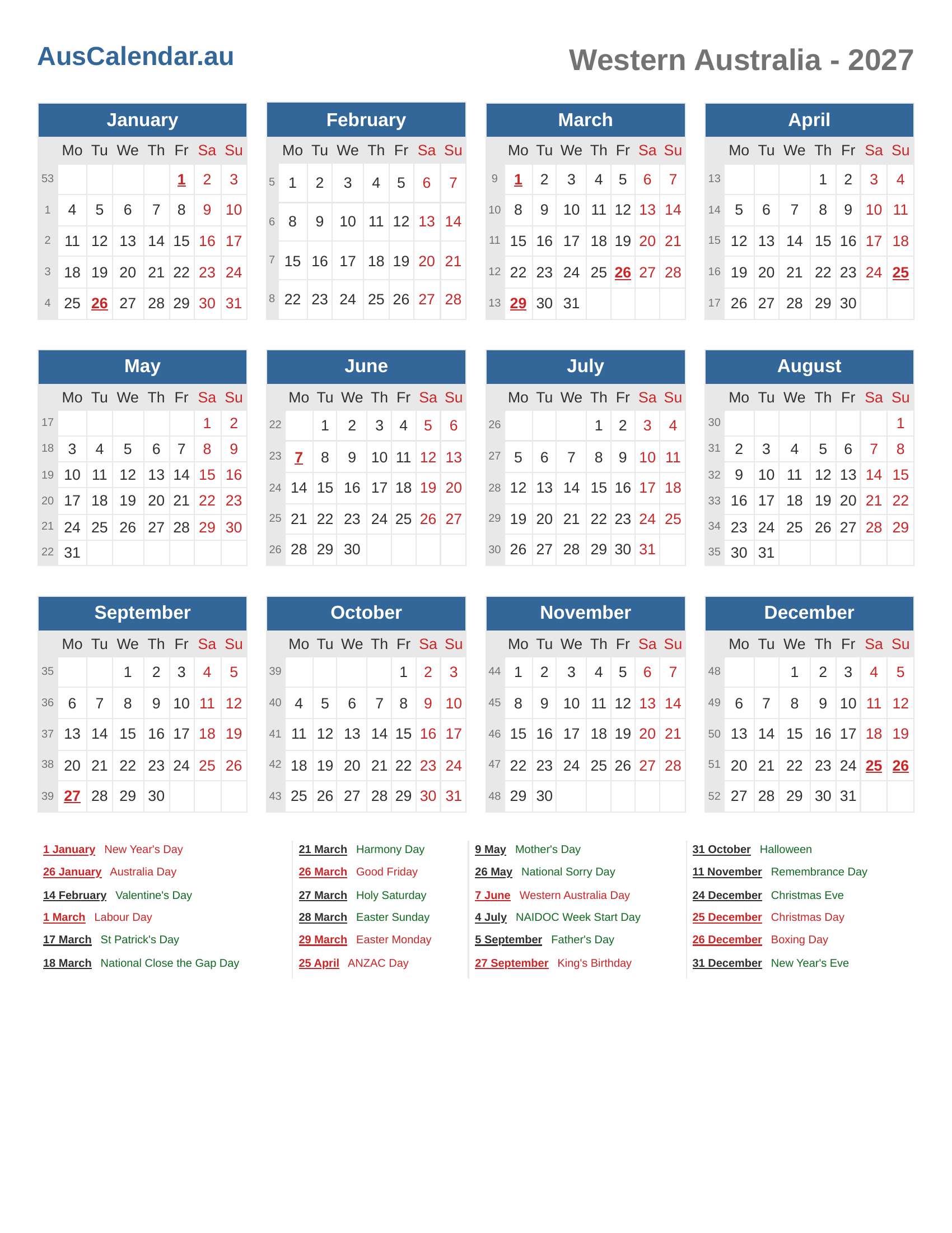 Public Holidays and Observances in 2027 (WA)