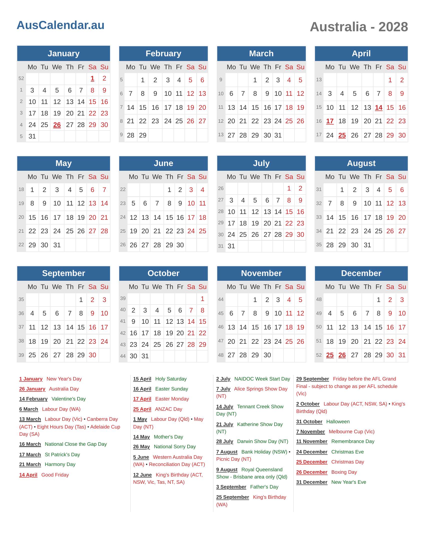 Calendar 2028 - Australia
