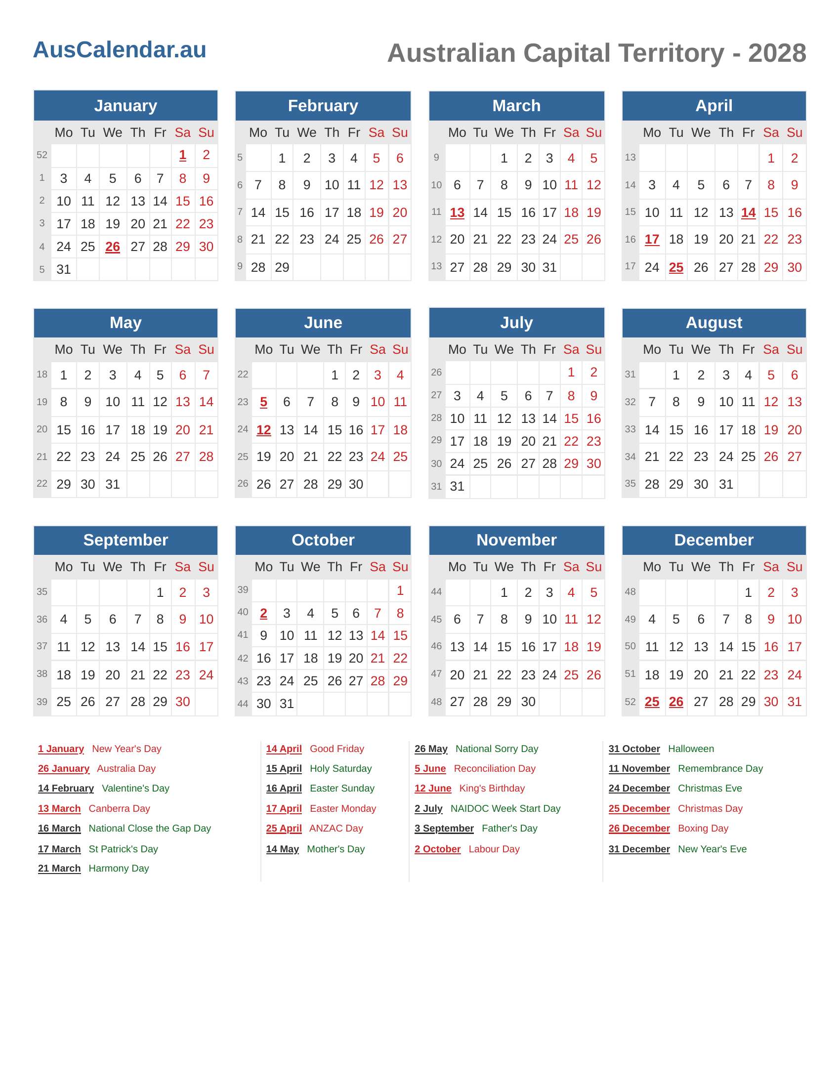 Public Holidays and Observances in 2028 (ACT)