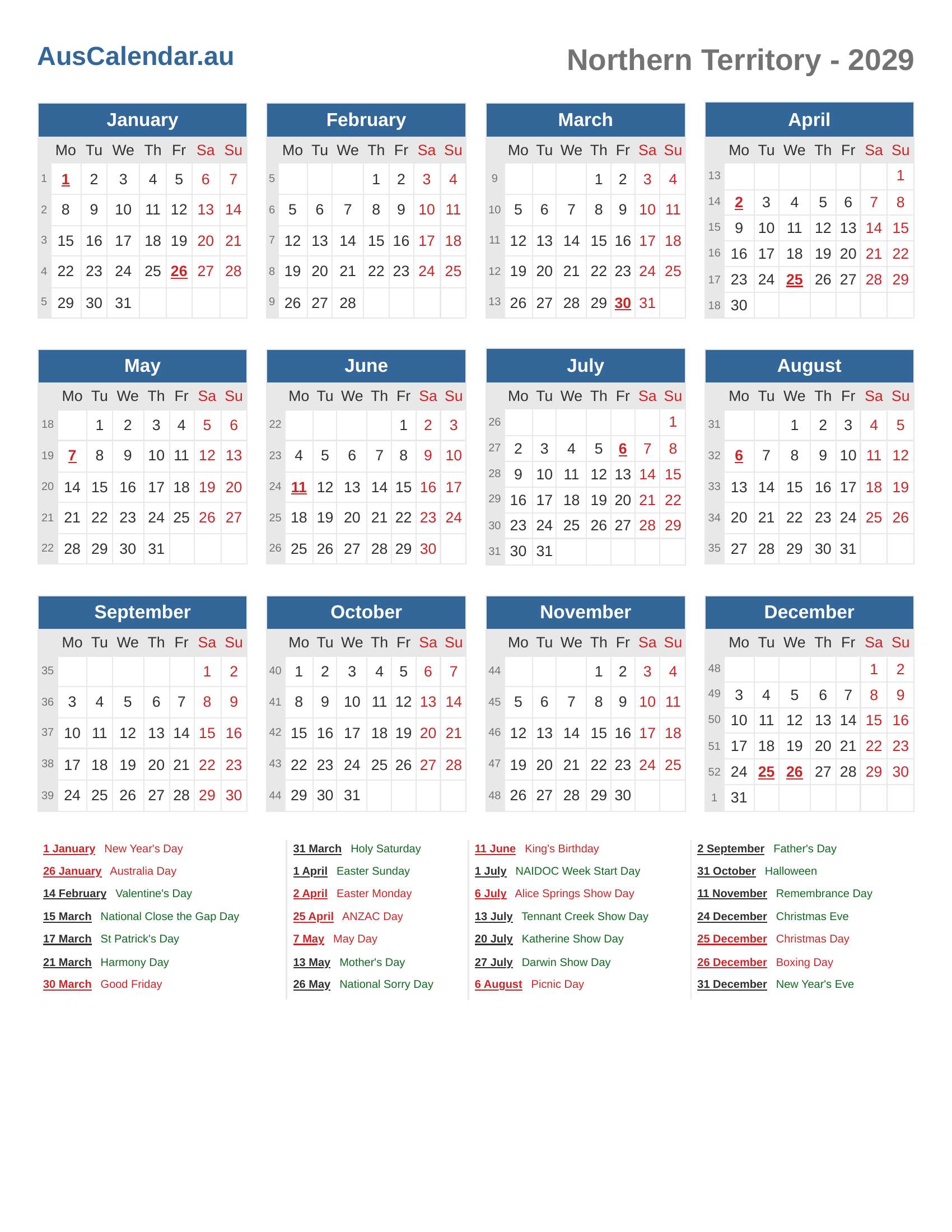 Public Holidays and Observances in 2029 (NT)